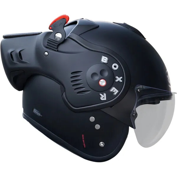 Homologué P/J (Intégral et Jet), le Boxer V8 S, avec sa mentonnière rotative à 180° assurant le maintien d’un bon aérodynamisme est désormais doté d’un nouveau joint à lèvre pour une étanchéité accrue, d’un nouvel habillage Silent Lining entièrement démontable, lavable, ajustable; d’un nouveau tissu traité antibactérien à séchage rapide, et d’une nouvelle boucle de jugulaire micrométrique.