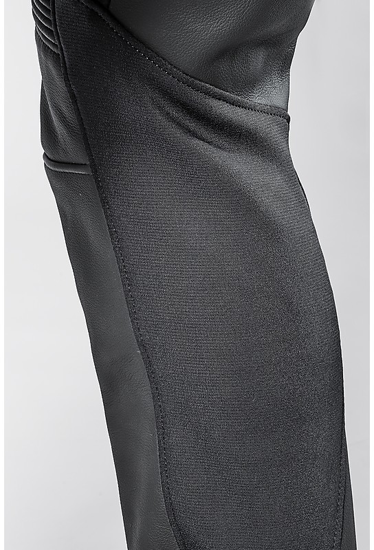 - Soufflets d’aisance en cuir flex accordéon à l’arrière de la taille et au-dessus des genoux augmentant la mobilité et la flexibilité lors de la conduite.